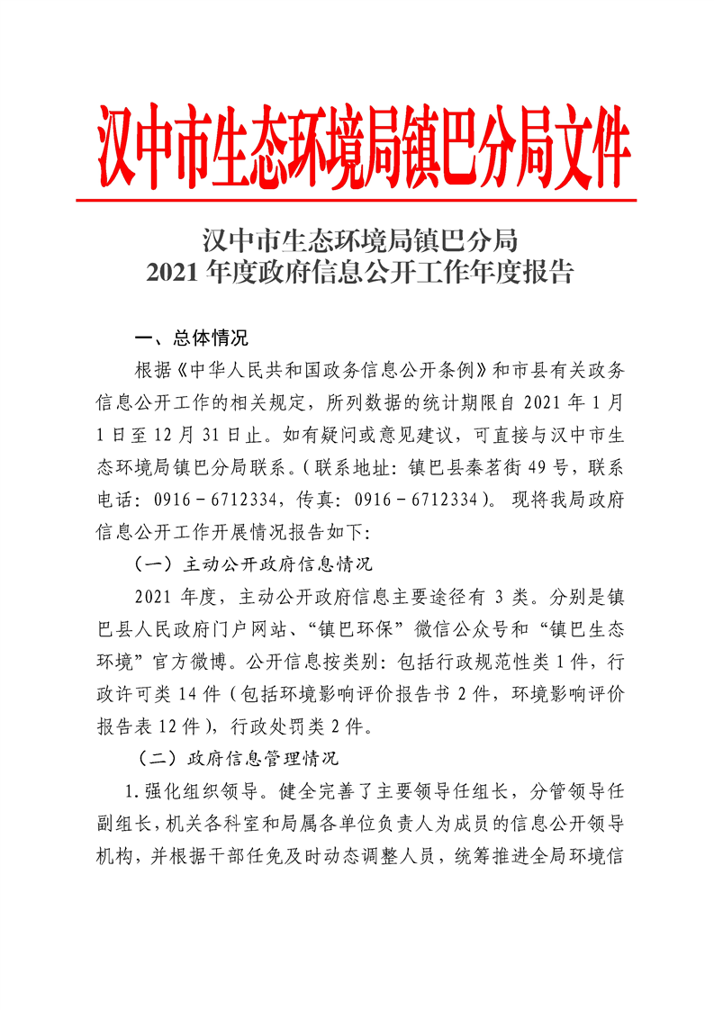 汉中市生态环境局镇巴分局2021年度hth华体会体育全站app下载工作年度报告