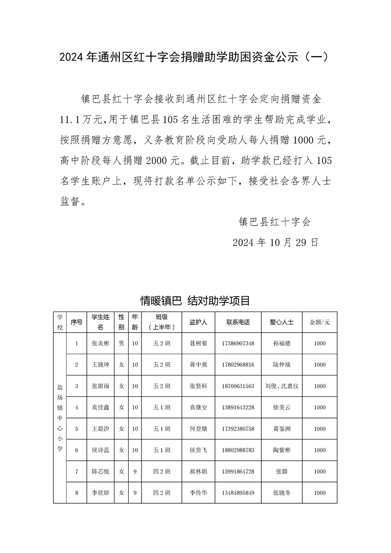 2024年通州区红十字会捐赠助学助困资金公示(一)