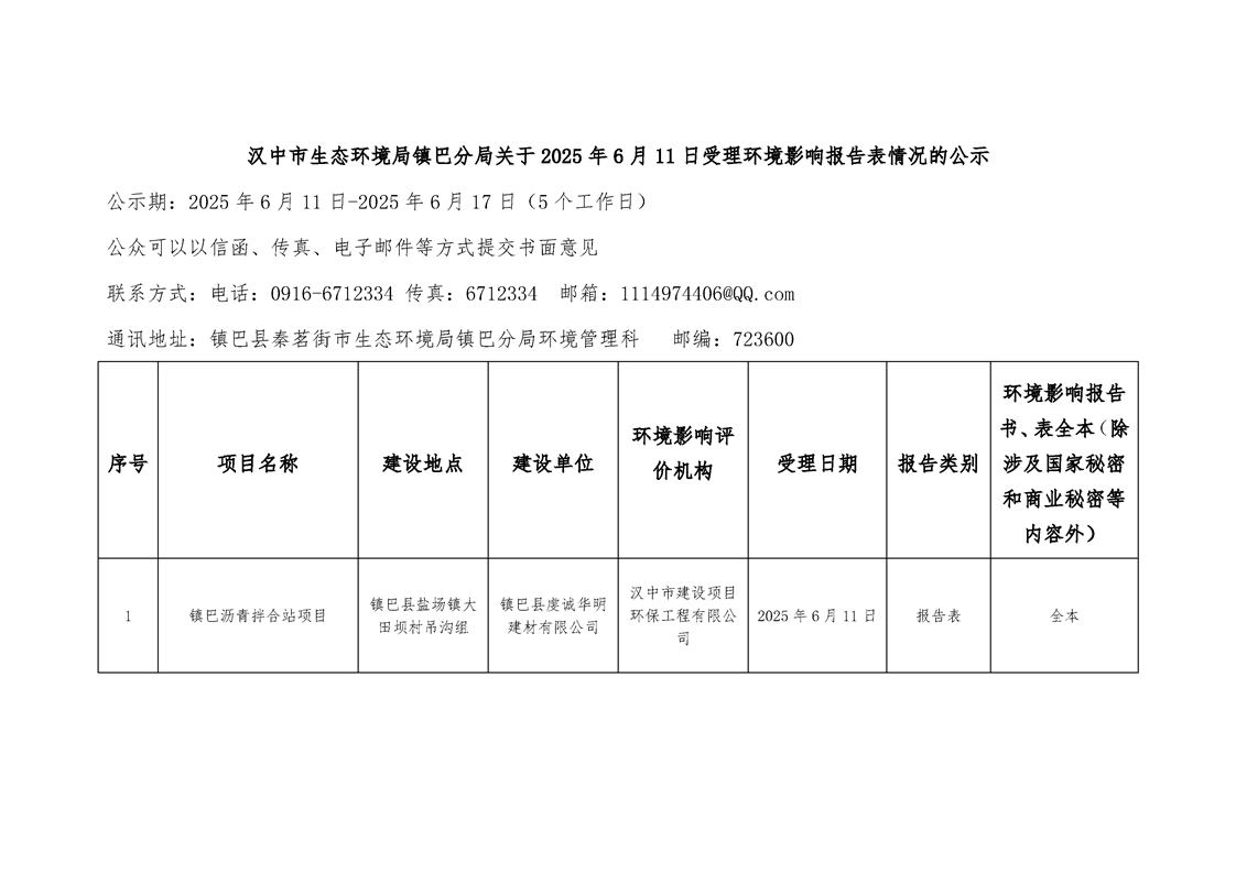 汉中市生态环境局镇巴分局关于2025年6月11日受理环境影响报告表情况的公示
