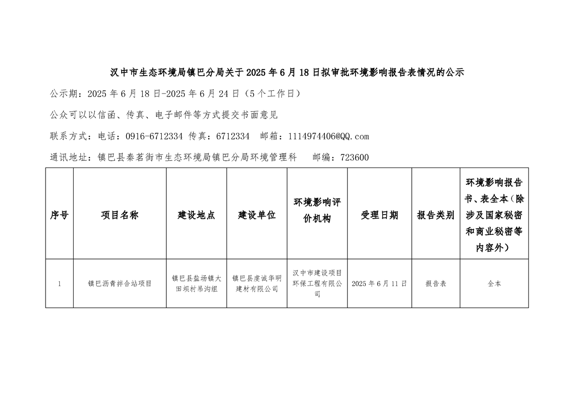 汉中市生态环境局镇巴分局关于2025年6月18日拟审批环境影响报告表情况的公示