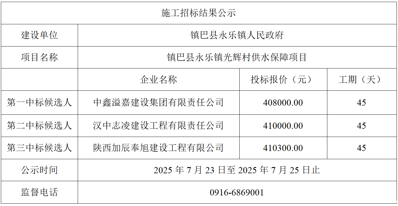 永乐镇光辉村供水保障项目施工评标结果公示