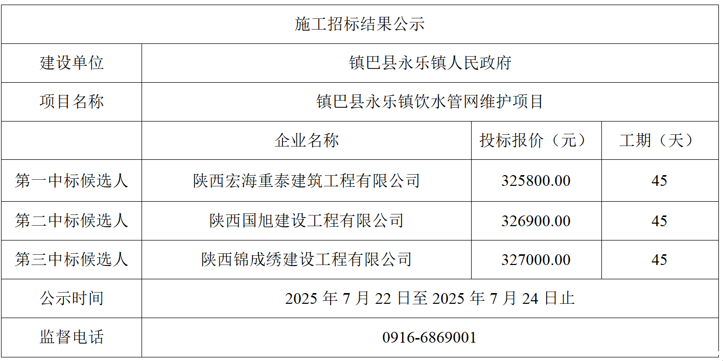 永乐镇饮水管网维护项目施工评标结果公示