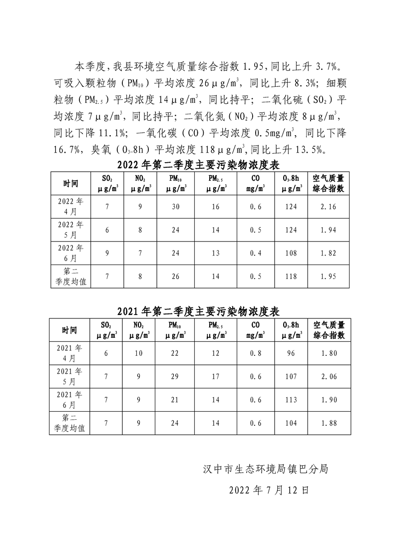 hth手机app下载二〇二二年第二季度环境空气质量简报