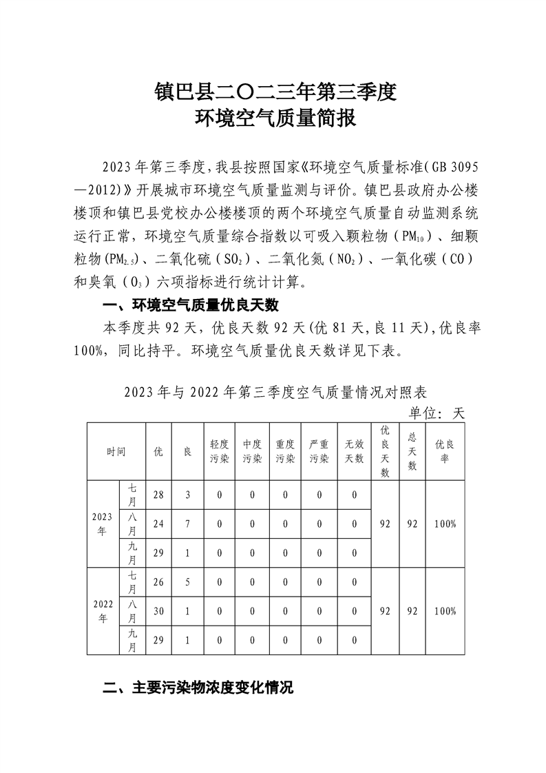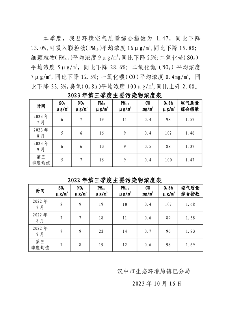 hth手机app下载二〇二三年第三季度环境空气质量简报