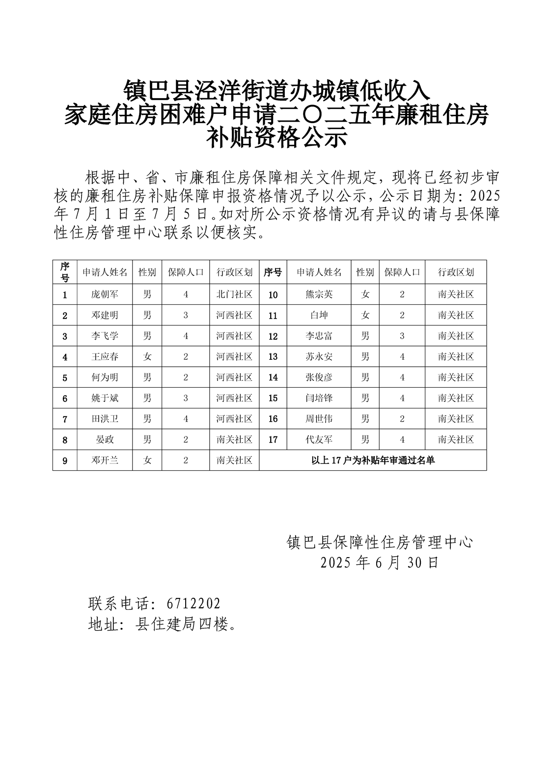 hth手机app下载泾洋街道办城镇低收入家庭住房困难户申请2025年廉租住房补贴资格公示